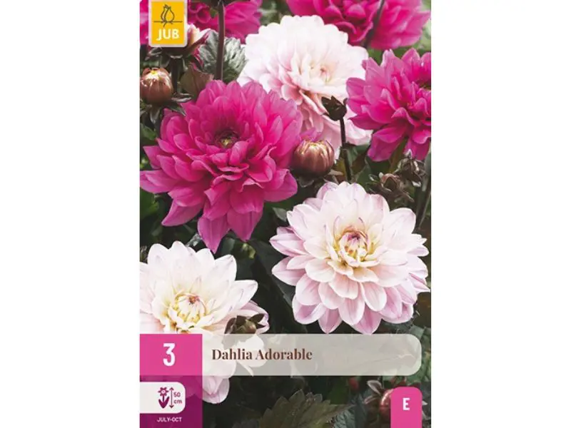 Die großblütigen, dekorativen Dahlienmischungen 'Adorable' sind dankbare Sommerblüter, die dir monatelang Freude bereiten. Dahlia-Mischung "Adorable" blüht den ganzen Sommer über von Juli bis zum ersten Frost. Dahlia 'Adorable' wird etwa 90–100 cm groß. hoch. Manchmal ist es notwendig, die Blütenstängel zu stützen. Dahlienknollen können im Frühling gepflanzt werden. Dahlia 'Adorable' ist frostempfindlich, also seien Sie vorsichtig bei nächtlichen Frösten. Grabe ein großes Pflanzloch, lockere die Erde und fülle das Pflanzloch mit guter Blumenerde. Setzen Sie die Knollen vorsichtig in das Pflanzloch und decken Sie sie mit 3–5 cm ab. Erde. Die Pflanzentfernung der Knollen beträgt 30–60 cm. Gib den Knollen nach dem Pflanzen sofort etwas Wasser. Dahlien blühen am üppigsten in voller Sonne. Bewahren Sie die Knollen nach der Blüte an einem frostfreien Ort auf, und Sie werden sie noch viele Jahre genießen. Dahlia 'Adorable' vereint sich gut mit Stauden und anderen Dahliensorten. Die Blumen sind echte Blickfanger im Beet. Dahlia 'Adorable' ist ebenfalls eine ausgezeichnete Schnittblume und kann lange in einer Vase aufbewahrt werden. Die beste Zeit, Dahlien zu schneiden, ist früh am Tag. Geben Sie die Stängel direkt in lauwarmes Wasser mit Schnittblumenfutter.