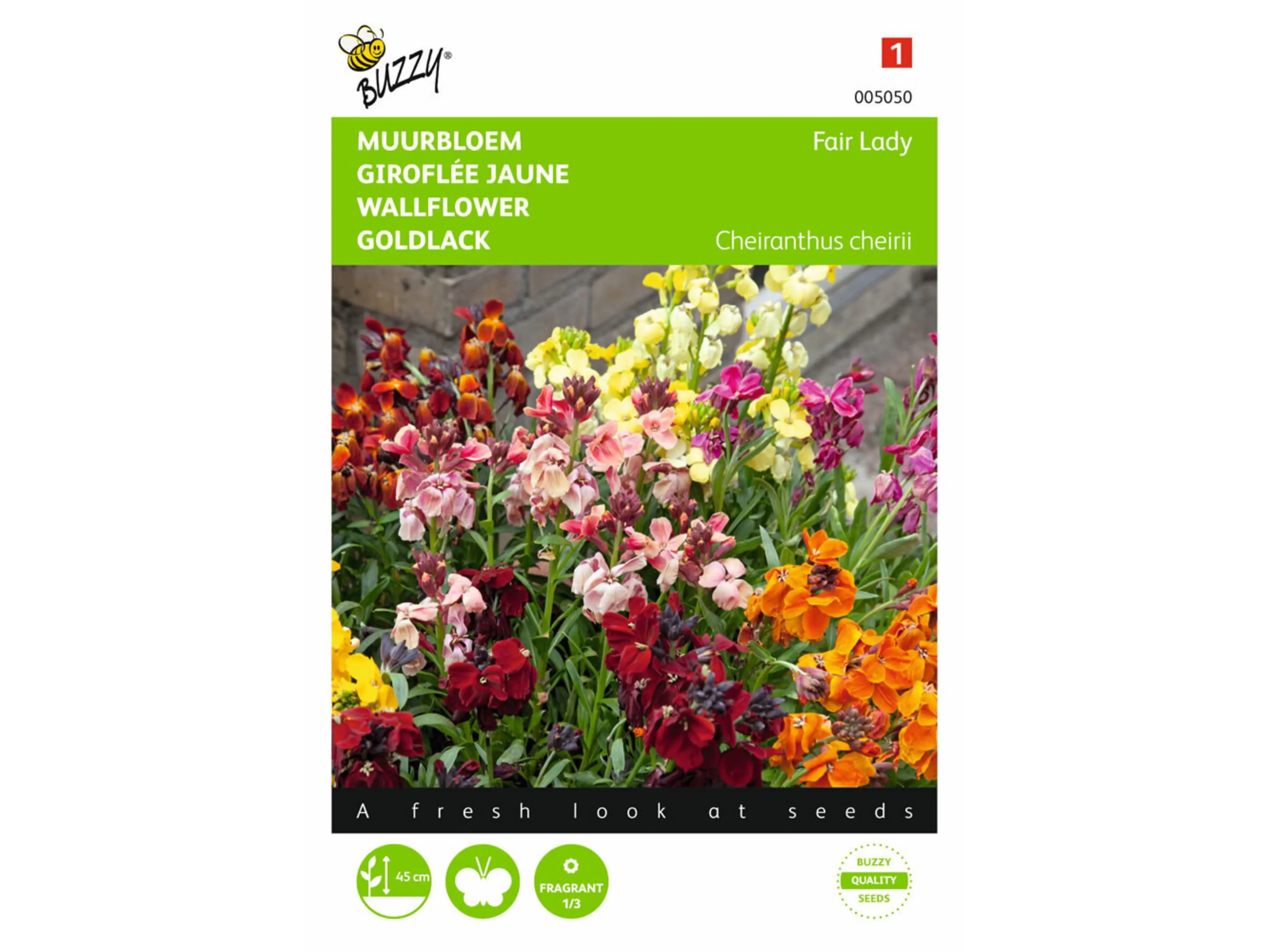 Wallflower Fair Lady hat Blüten wunderschön in allen möglichen warmen Rot-, Gelb-, Braun- und Lilatönen gemischt. Es ist eine üppig blühende Pflanze mit wenigen Blüten und einem sehr kompakten Wuchs. Diese Pflanze fühlt sich im Rat und entlang der Wand vollkommen gut und kann auch als Schnittblume verwendet werden. Die Pflanze hat einen wunderbaren Duft und zieht viele Schmetterlinge an.