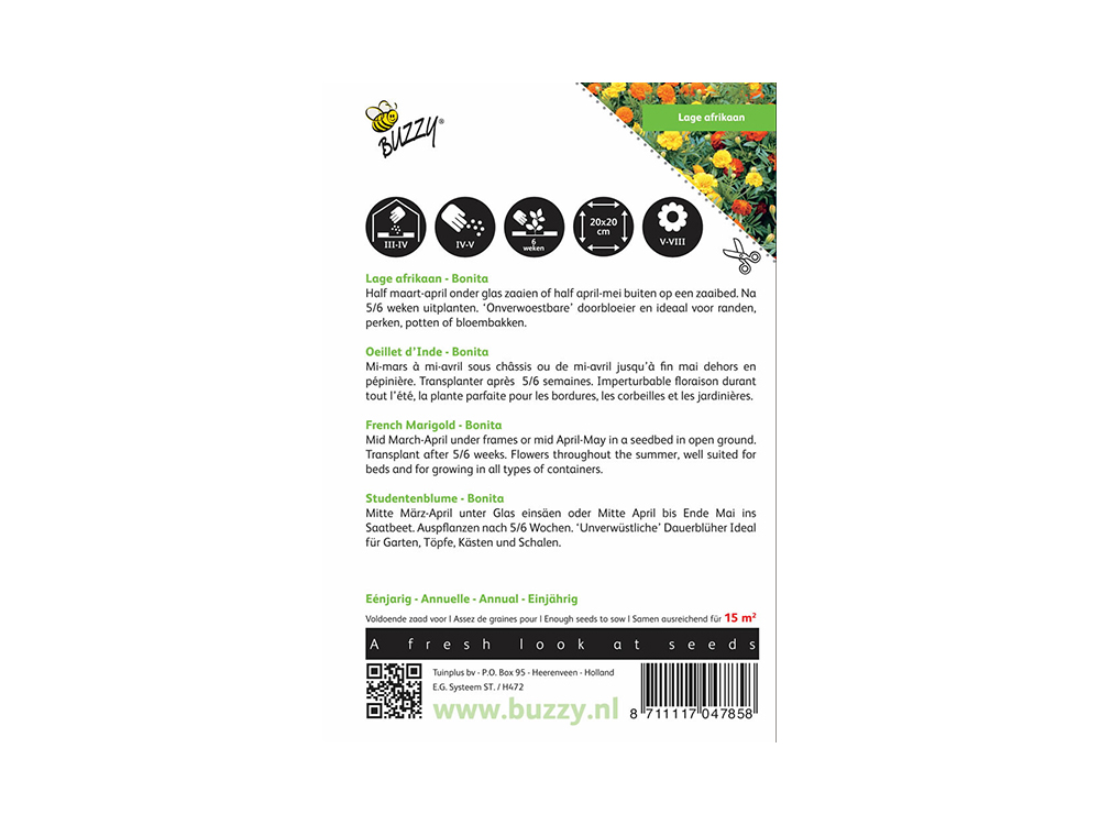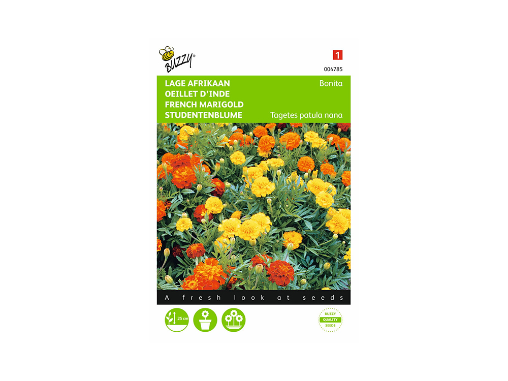 Niedrigafrikanische Bonita ist ein einjähriges, kompakt wachsendes Mischling, das sich zum Pflanzen in Beeten, Beemte und Blumenkästen eignet.