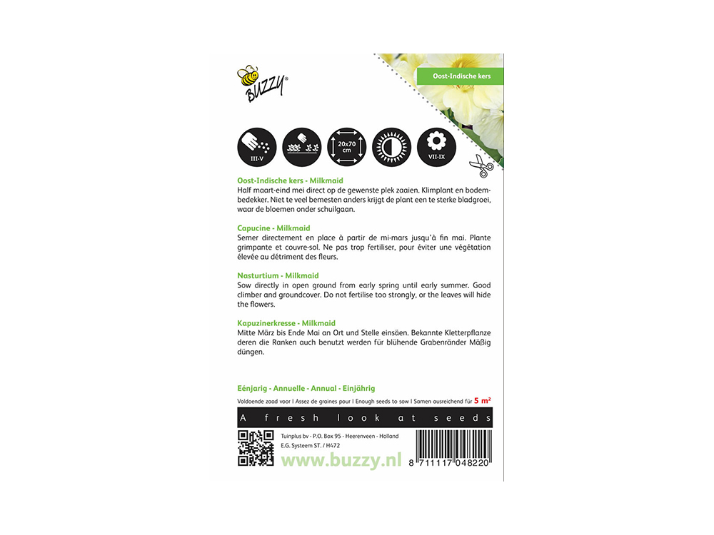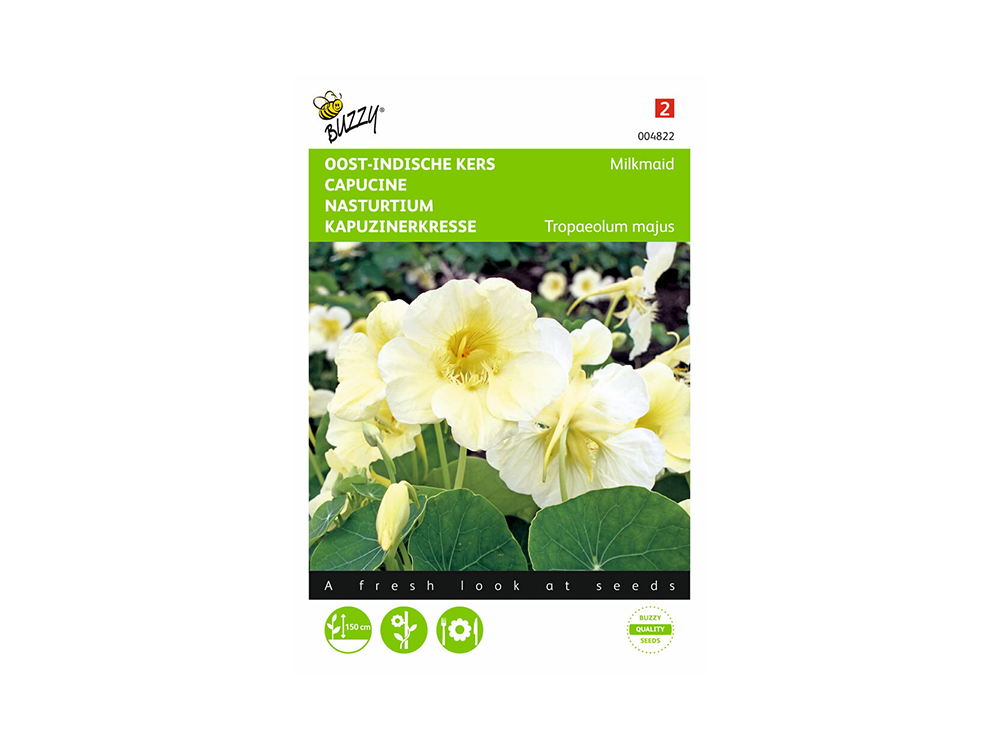 Kapuzinerkresse hat wunderschöne, cremige weiße Blüten. Die Pflanze ist ein starker Kletterpflanze und daher ideal, um eine langweilige Gartenmauer aufzuhellen. Natürlich kannst du die Pflanze auch als Bodendecker verwenden. Die Pflanze erfordert wenig Pflege und ist wenig anspruchsvoll. Die Blüten sind essbar und können als Garnitur für Gerichte dienen; die Samen können als Kapern eingelegt werden.