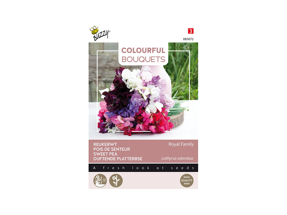 Die königliche Familie der Süßerbsen gehört zur wunderbar duftenden einjährigen Lathyrus-Art. Es ist eine sehr vielfältige Farbmischung, die von Juni bis Oktober in Weiß-, Rot-, Rosa- und Lilatönen reichlich blüht. Mit duftenden Erbsen können Sie jeden Tag einen Strauß aus Ihrem eigenen Garten pflücken.