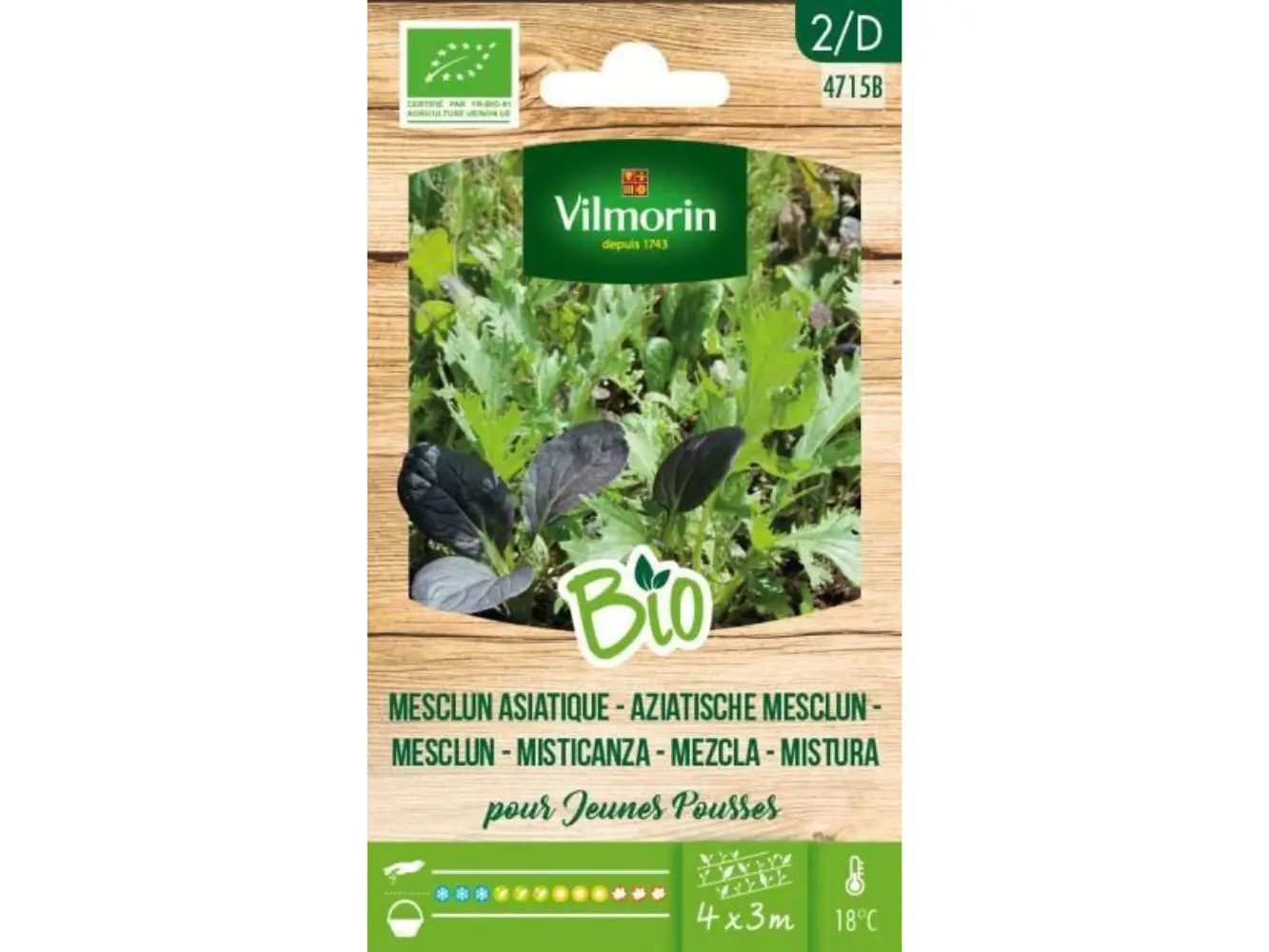 Züchten Sie Ihren eigenen leckeren Kohlsalat, komplett biologisch mit den hochwertigen Samen von Vilmorin. Asiatischer Mesclun ist eine Mischung verschiedener chinesischer Kohlsorten, rotem Senf und Mizuna, was Salaten einen asiatischen Touch verleiht. Die Blätter werden in einem frühen Stadium geerntet.