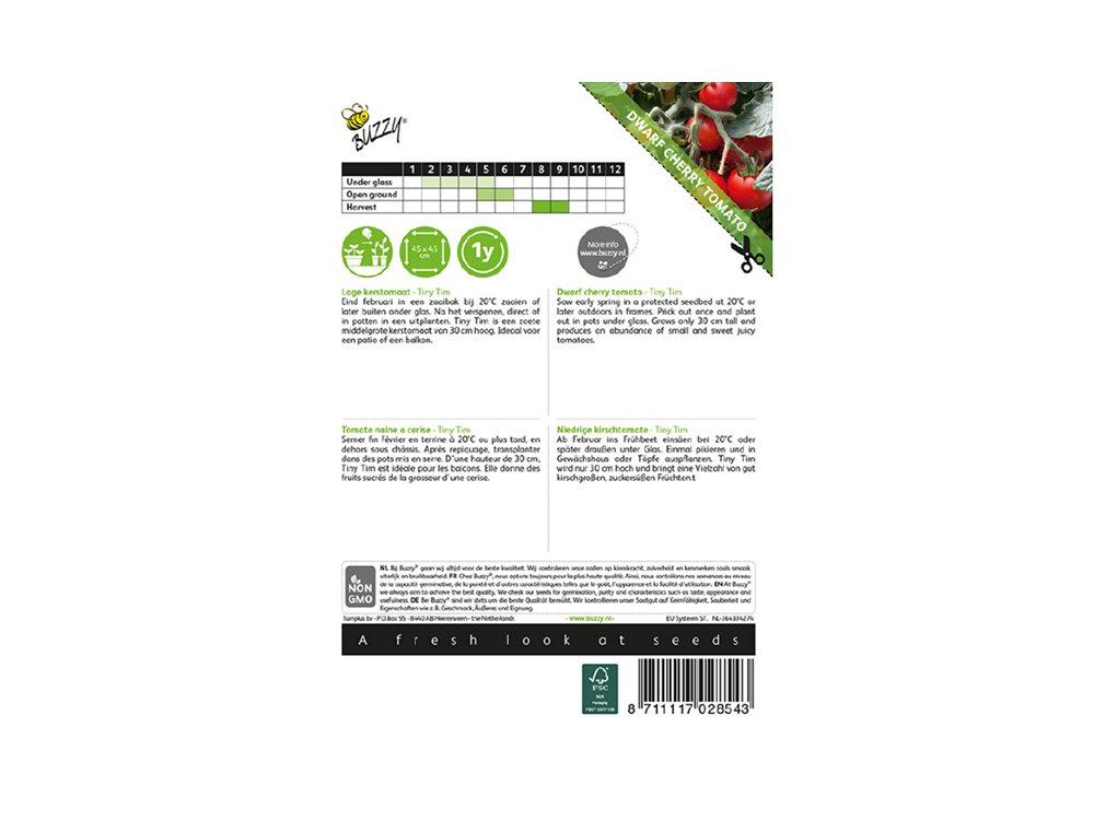 Pflanze Kirschtomaten Tiny Tim ab Ende Februar in einer Samenschale bei 20°C oder später draußen unter Glas. Nach dem Umpflanzen können Sie sie drinnen in Töpfen pflanzen.