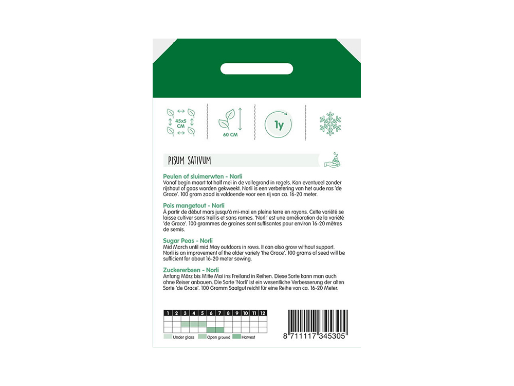 Sät in Reihen von Anfang März bis Mitte Mai auf offenem Boden. Kann ohne Buschholz oder Drahtgeflecht angebaut werden.