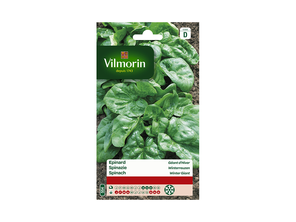 Diese hyperproduktive Spinat-Winter-Riesensorte bildet große, glatte, dunkelgrüne Blätter und ist sehr frostresistent. Ideal zum Ernten im Winter. Spinat ist reich an Eisen und Vitaminen (A, B, C, E, K und PP).
