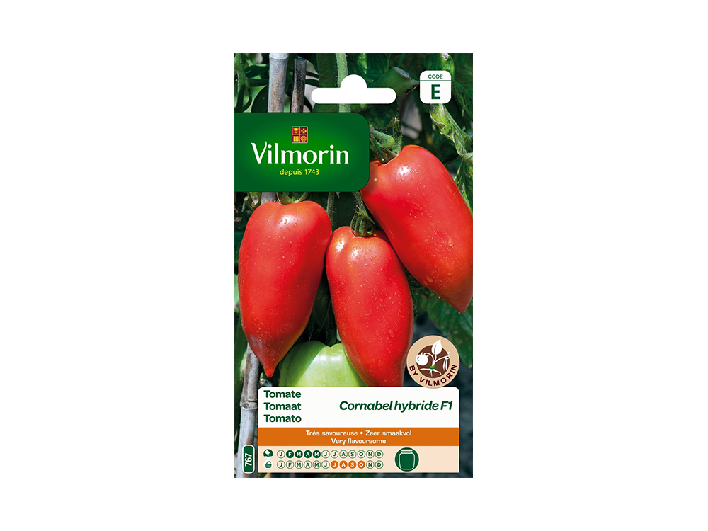 Diese ursprüngliche, kräftige und frühe Sorte Tomato Cornabel bildet lange und schwere Früchte in Form eines Horns. Sie sind sehr lecker und zuckerhaltig.