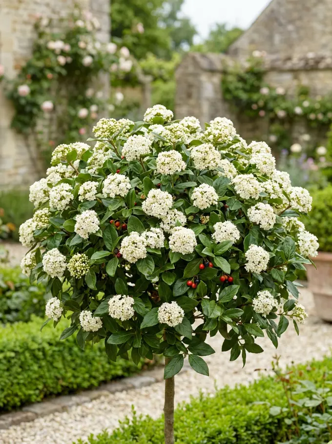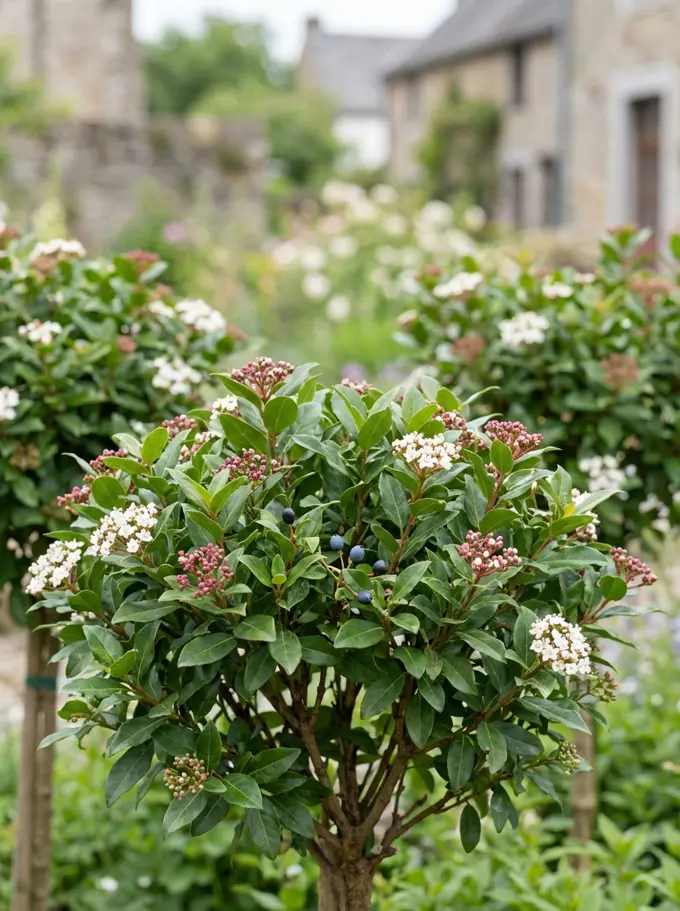 Viburnum tinus als dankbarer immergrüner, blühender Zierstrauch