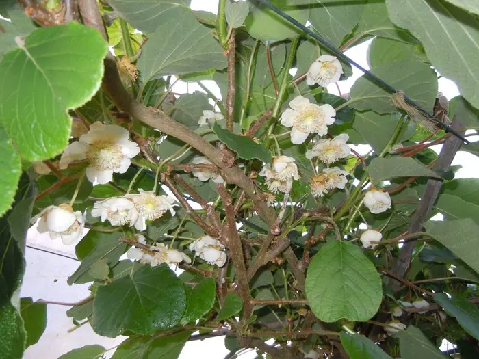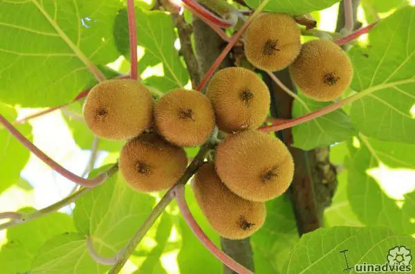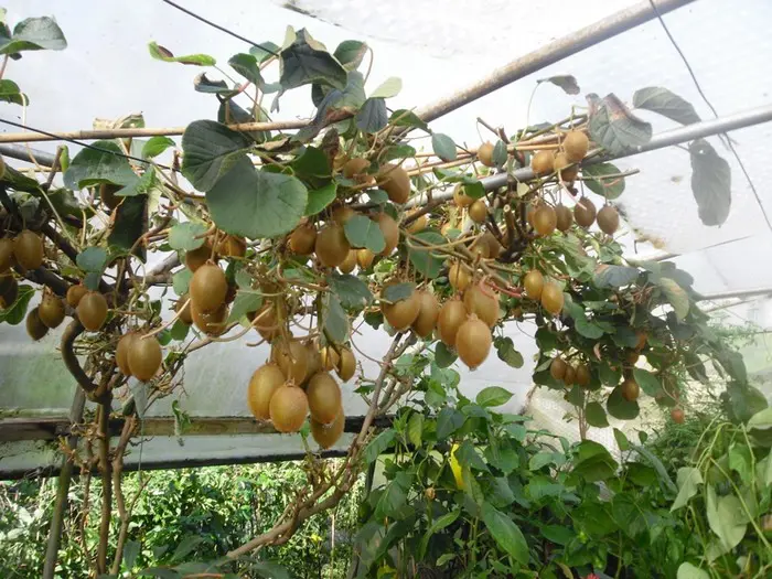 Wenn sich eine männliche Pflanze in der Nähe befindet, besteht die Möglichkeit, dass kleine essbare Früchte auf dieser zweihäusigen Kletterpflanze erscheinen. Actinidia deliciosa sprießt früher. Die Früchte sind bei dieser Art fast haarlos. Das Fruchtfleisch ist gelb, gelbgrün oder grün, manchmal um den Kern rötlich.