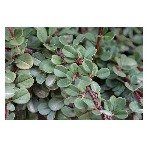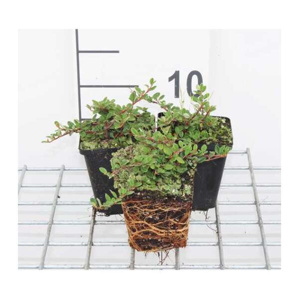 Cotoneaster procumbens 'Queen of Carpets' ist ein sehr flacher, kompakter Strauch, der besonders im Herbst und Winter wegen der roten Beeren, die besonders bei Vögeln begehrt sind, besonders schön ist.