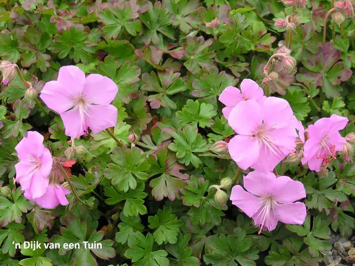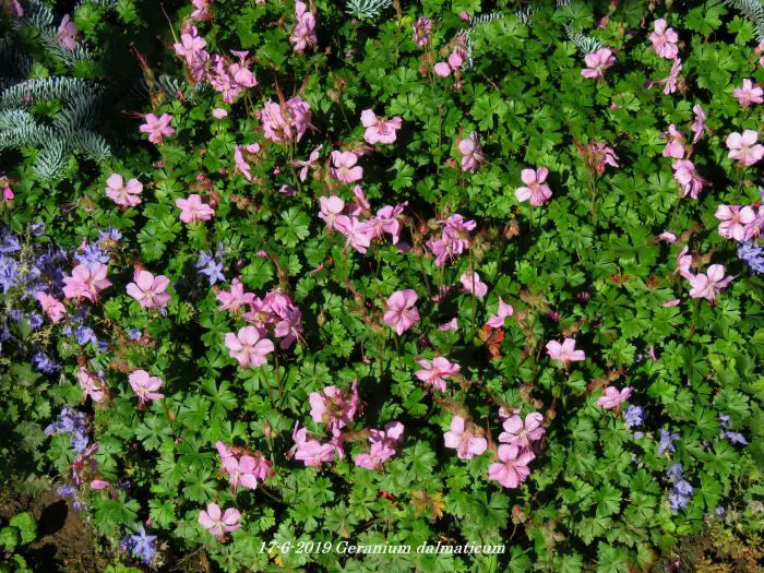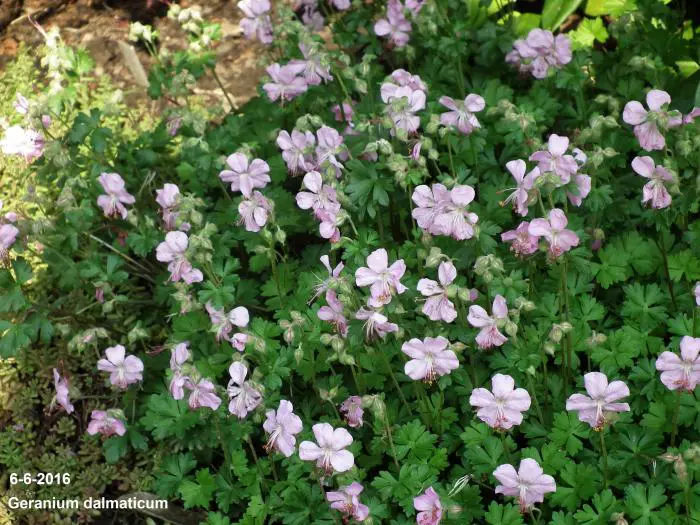 Geranium dalmaticum bildet einen niedrigen, langsam ausbreitenden Teppich mit kleinen aromatischen, glänzend dunkelgrünen Blättern und blüht üppig mit blassrosa Blüten.