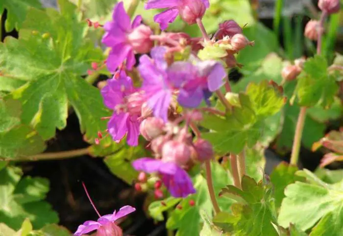 Blüht etwas später als die Art, mit magentaren Blüten über einem runden, flaumigen aromatischen Blatt. Im Herbst färben sich die Blätter rot und bronzefarben.