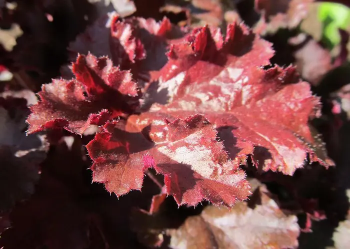 Heuchera 'Melting Fire' ist ein Hybrid mit wunderschönen dunklen burgunderroten Blättern und stark welligen Kanten.