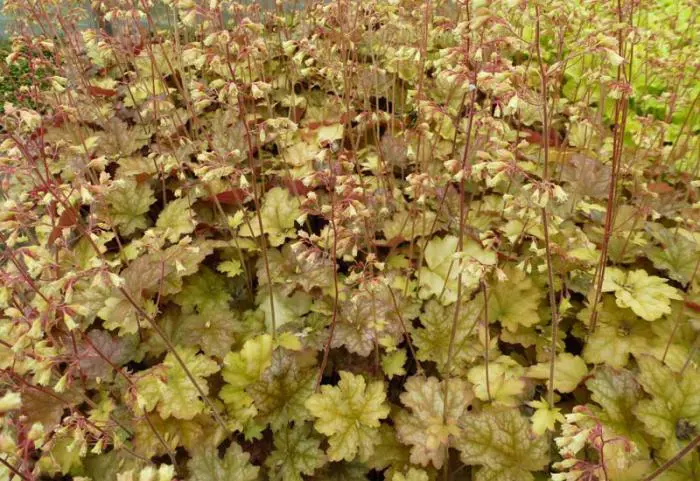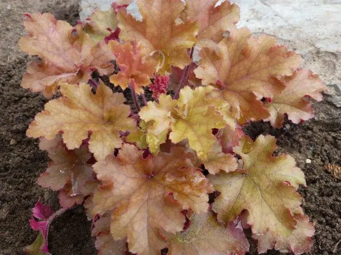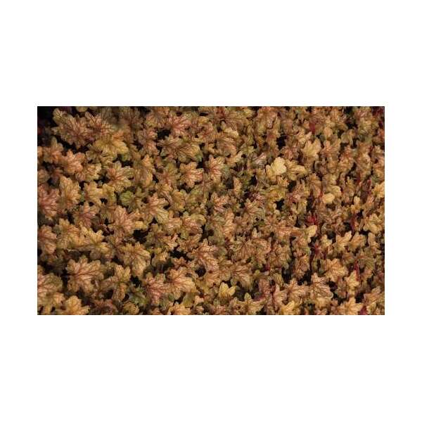 Die Blätter des Heuchera 'Ginger Ale' sind gelb-orange mit einem silbernen Schimmer und blühen mit Lichtrismen aus blassrosa Blüten.