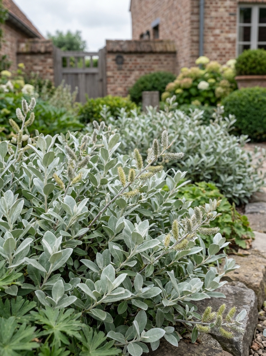 Salix repens var. Nitida ist ein buschiger Strauch mit langen, überhängenden Ästen mit samtigen silbergrauen Blättern und im Frühjahr gelben Klatzen mit roten Tönen auf dem nackten Holz. .