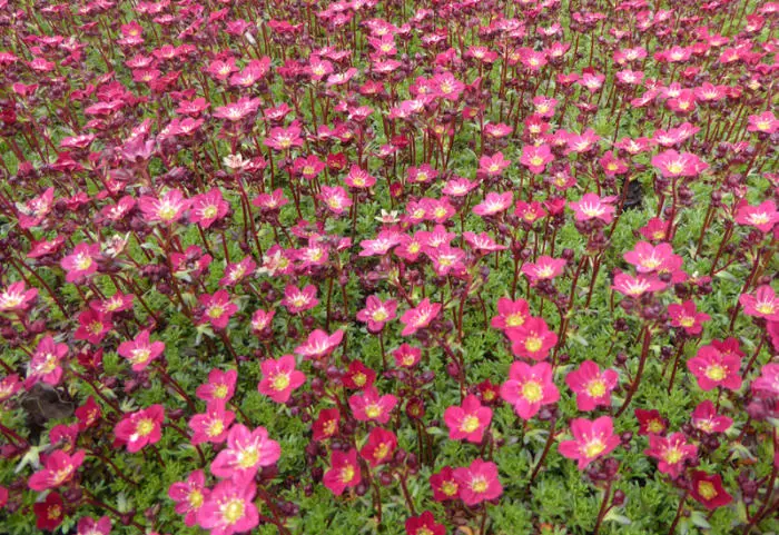 Saxifraga 'Peter Pan' ist eine reich blühende Felspflanze mit einem kleinen, glänzenden, leuchtend grünen Blatt und sternförmigen, karminroten Blüten an roten Stängeln, die manchmal rötlich-braun werden.