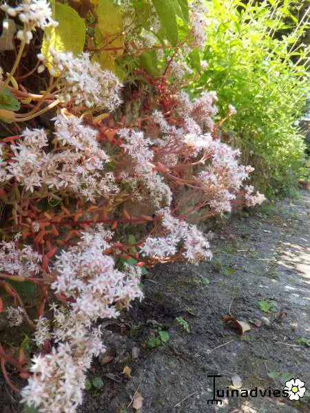 Die weißen bis blassrosa Blüten sind sehr zahlreich, und die fleischigen, gezackten und lanzettförmigen Blätter werden im Herbst rötlich-braun.