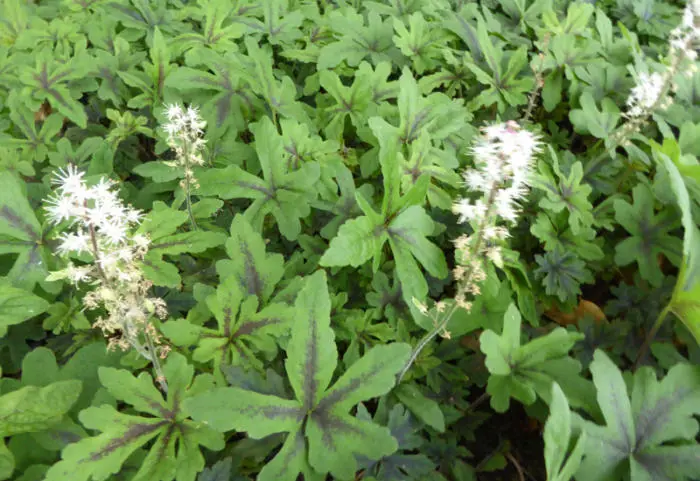 Tiarella 'Iron Butterfly' hat große, handflächenartige, grüne Blätter mit einer purpurbraunen Farbe um die Adern.