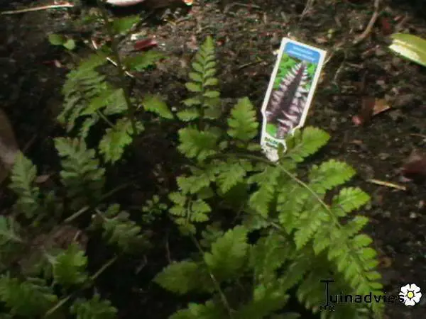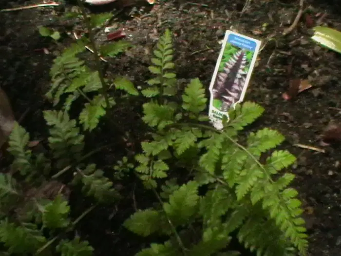 Die Blätter der Dryopteris erythrosora 'Japanische Malerei' sind blau mit großen silberfarbenen Spitzen.Die Venen sind dunkelrot.