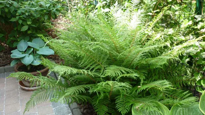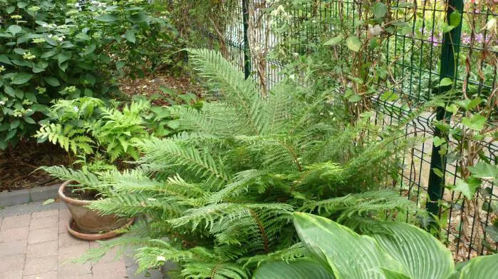 Polystichum setiferum 'Pulcherrimum Bevis' ist ein großer Farn mit glänzend grünen Blättern.