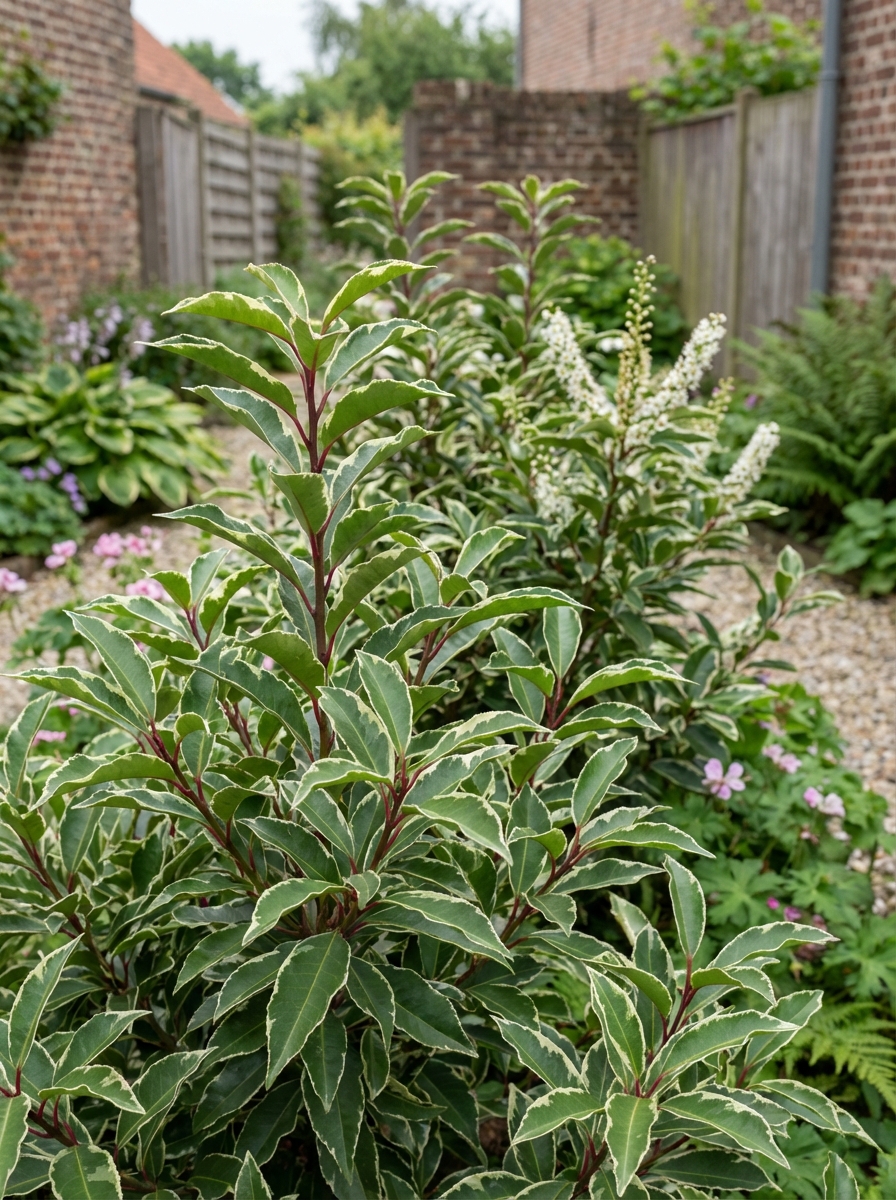 Prunus lusitanica 'Variegata' ist ein großer Strauch mit dunkelroten Zweigen und lederartigen, schmalen, weiß-brochen/dunkelgrünen Blättern.
