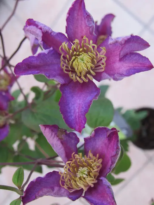 Clematis 'Exciting' (Gruppe von Patenen) ist ein niedriger Kletterpflanze mit kleineren Blüten, deren Ränder leicht nach innen krümmen. Sie blühen violett mit auffällig goldgelben Staubblättern.