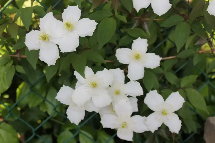 Clematis montana 'Grandiflora' wächst stark und blüht mit weißen Blüten und gelben Staubblättern.