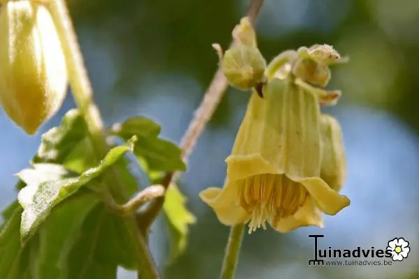 Blüht mit Büscheln von hängenden weichen gelben bis grünlich-gelben Glocken. Die Blütenblätter sind an den Spitzen zusammengerollt.