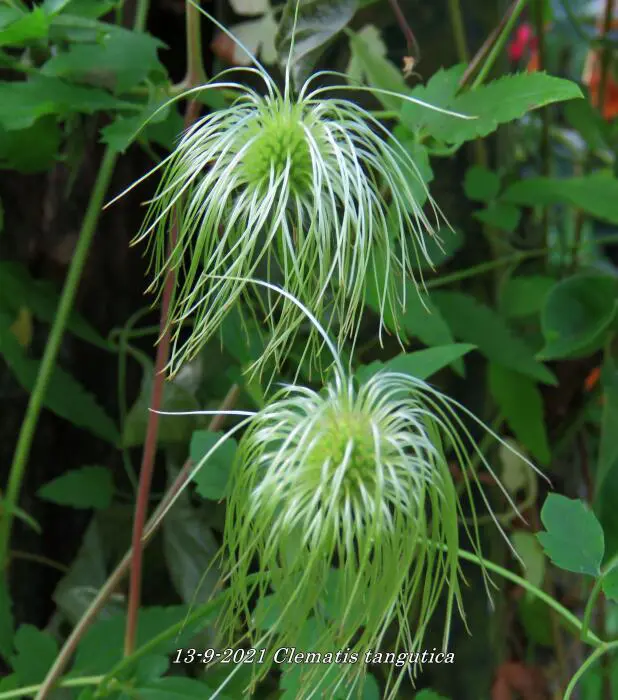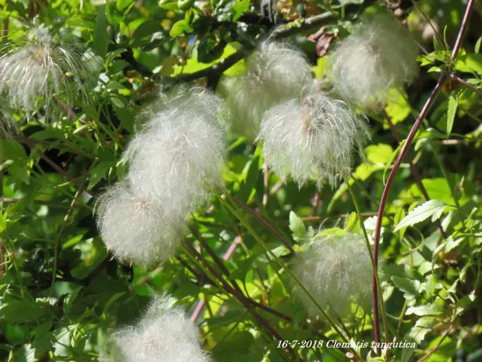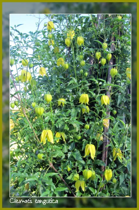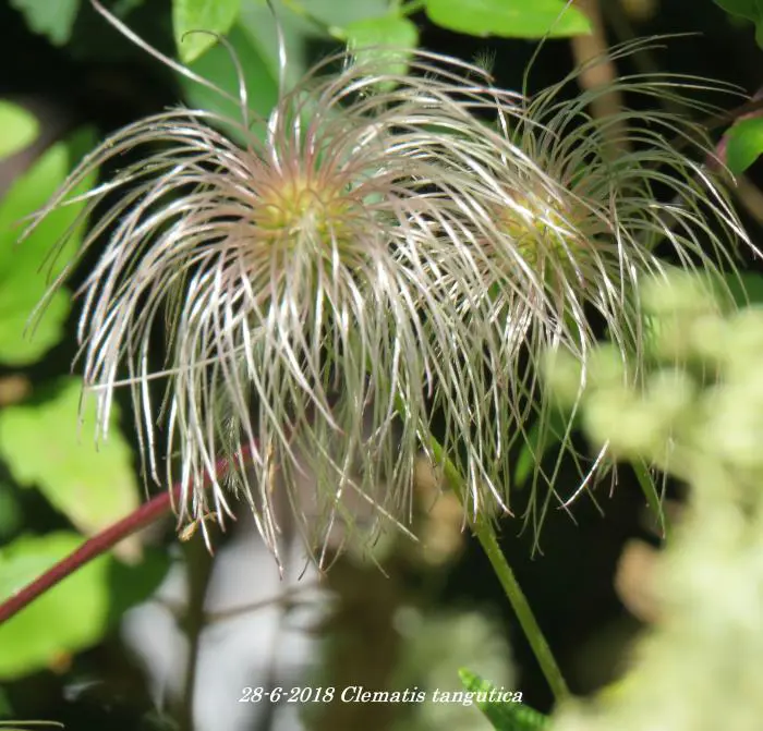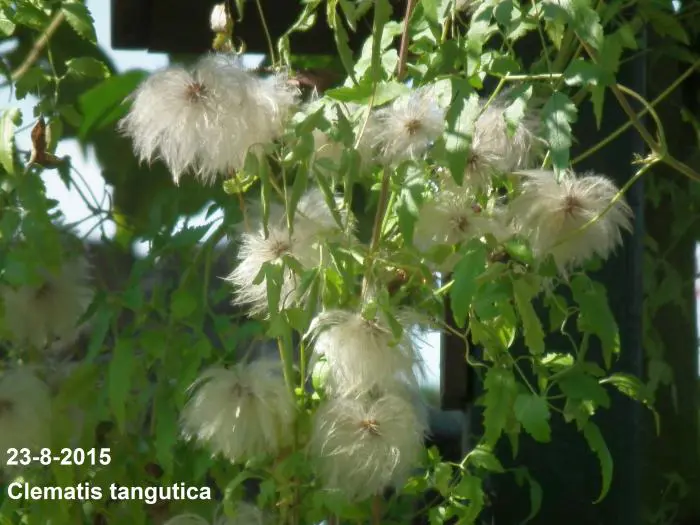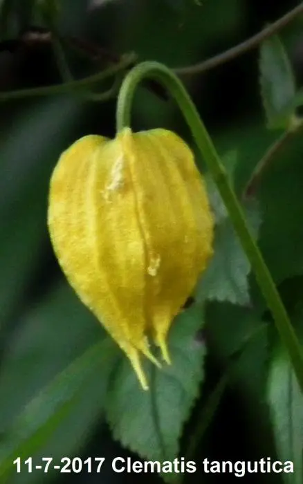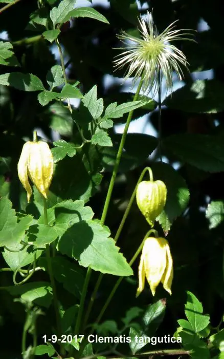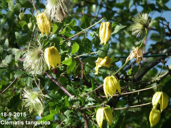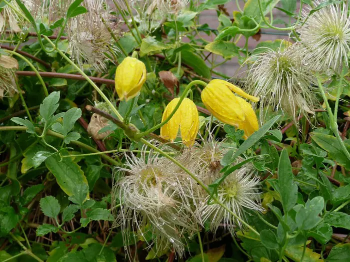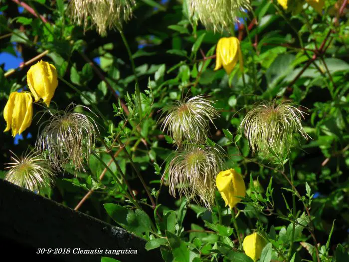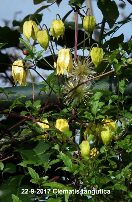 Clematis tangutica blüht mit hängenden laternenförmigen Blüten, gefolgt von wunderschönem Samenfluff.
