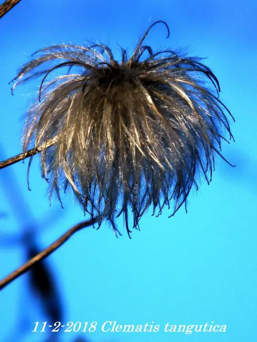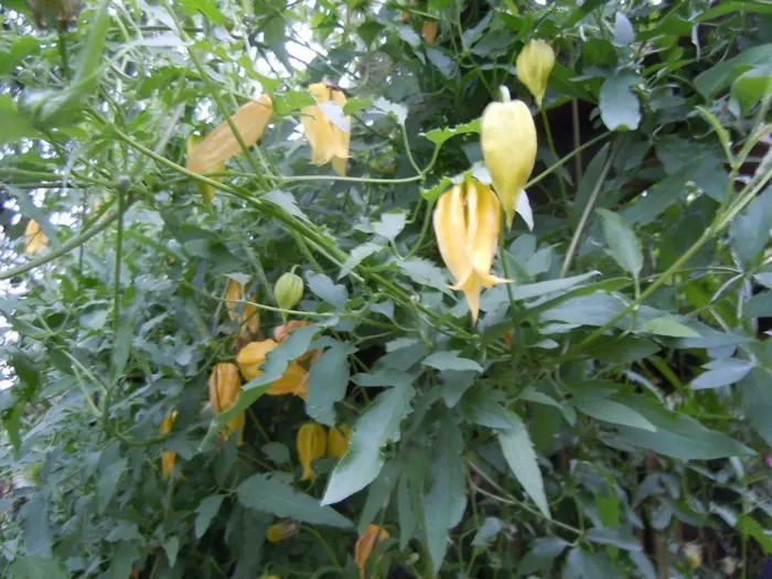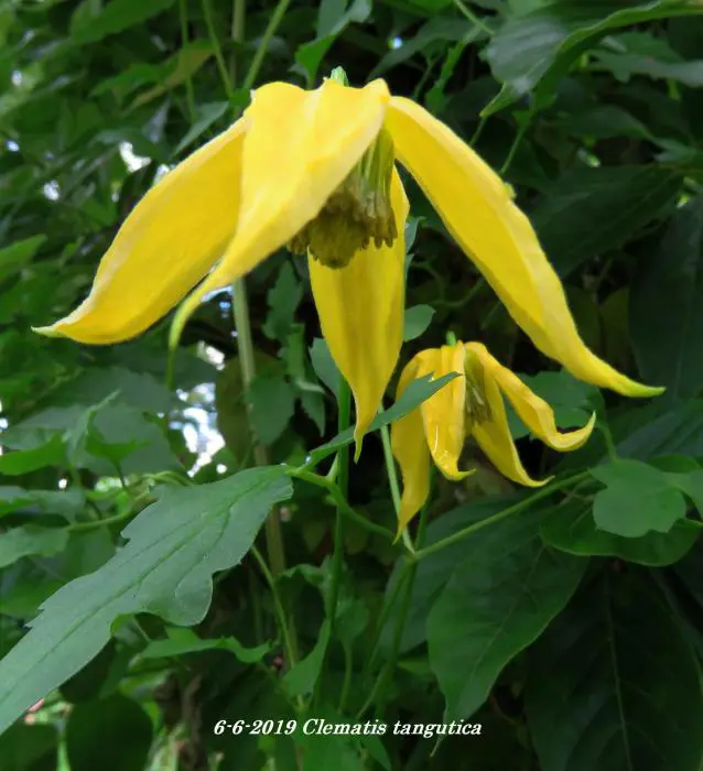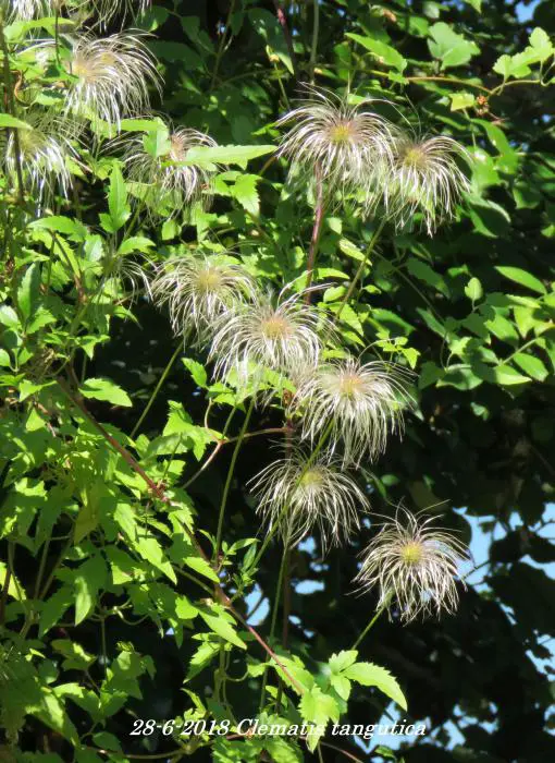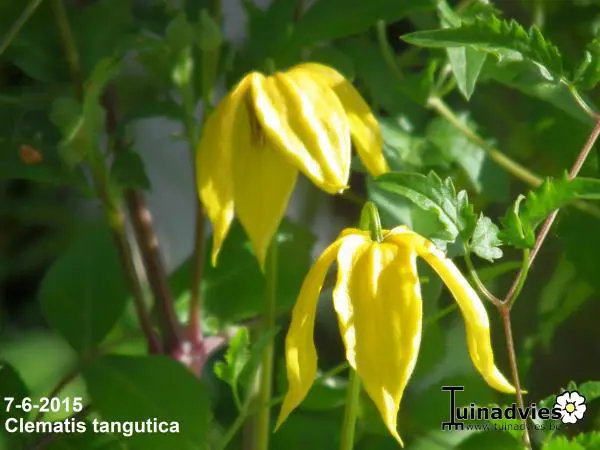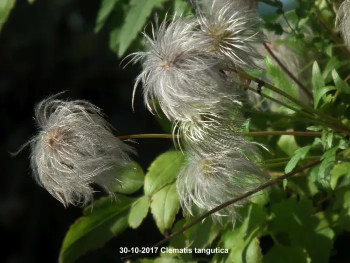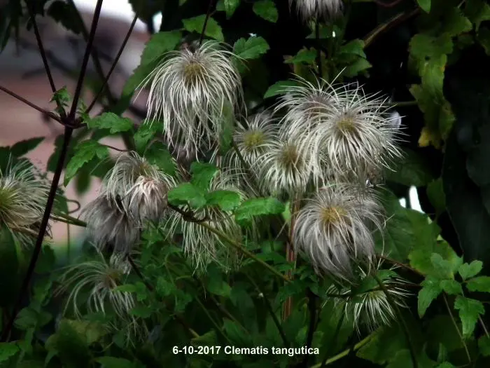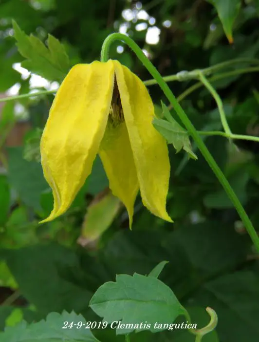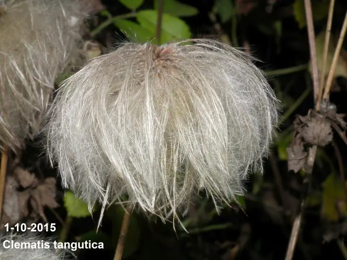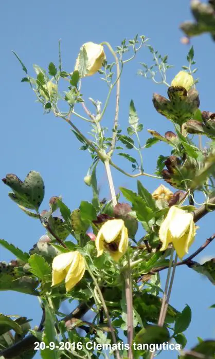Clematis tangutica blüht mit hängenden laternenförmigen Blüten, gefolgt von wunderschönem Samenfluff.