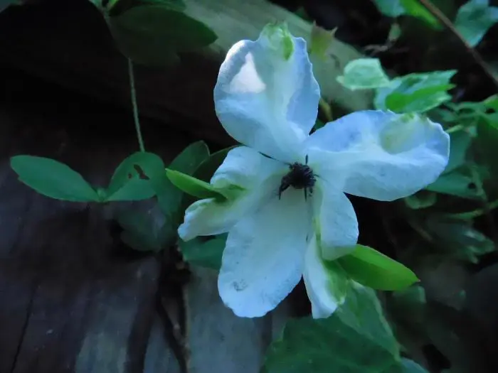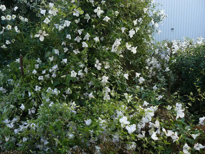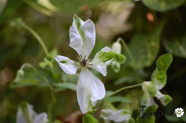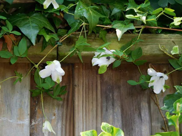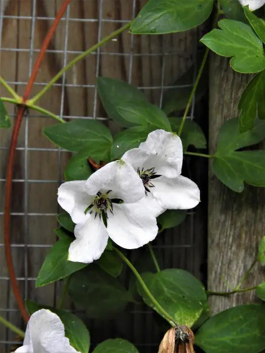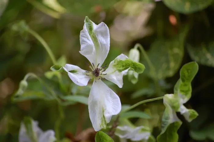 Clematis viticella 'Alba Luxurians' blüht zunächst mit grünen Blüten, die später weiß werden. Die später blühenden beginnen weiß, manchmal mit grünen Spitzen.