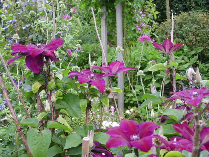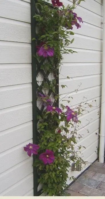 Sie sind frühe großblühende Clematis, die auf dem alten Holz blühen.