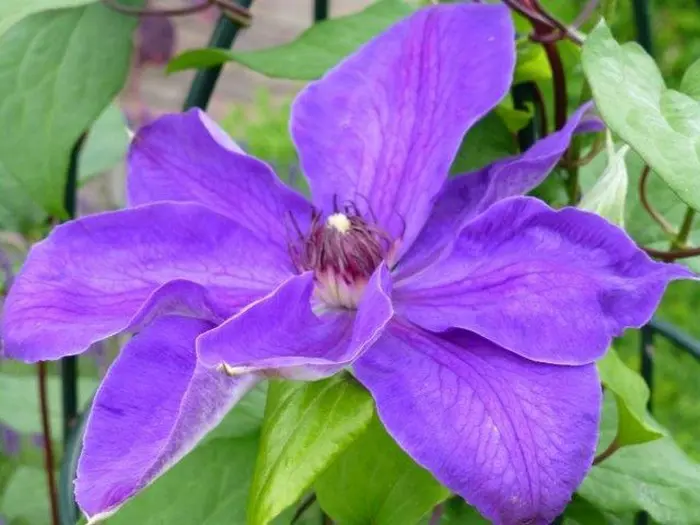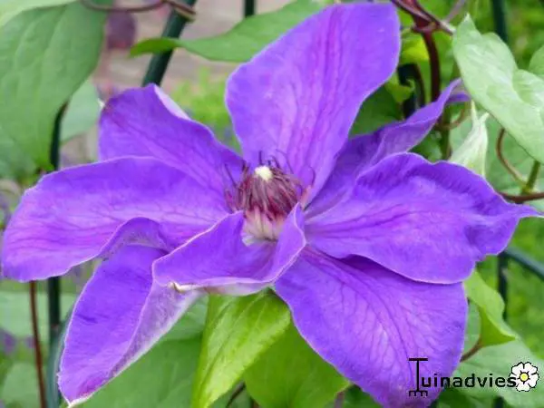 Clematis 'Xerxes' (Patenengruppe) blüht mit großen, violett-blauen Blüten.
