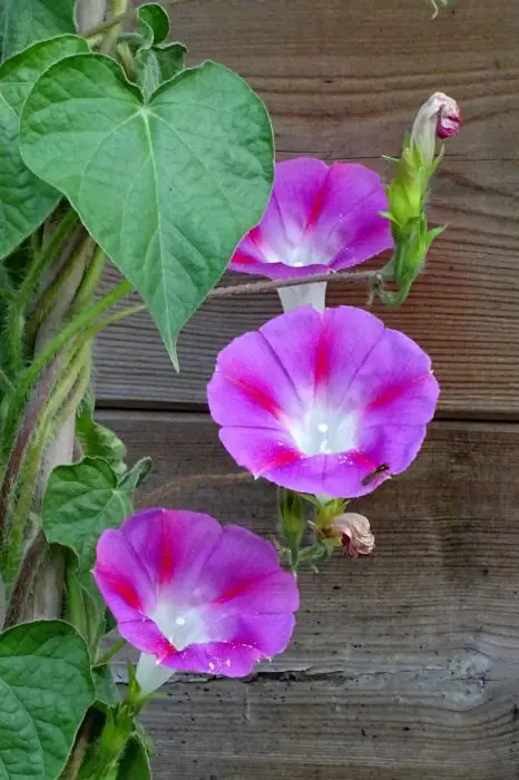 Ipomoea purpurea 'Lazy Lux' ist eine einjährige Ranke, die sehr schnell wächst und blüht, mit großen, auffälligen, trompetenförmigen Blüten in Blau-, Weiß-, Blau-, Rosa- und Lilatönen.