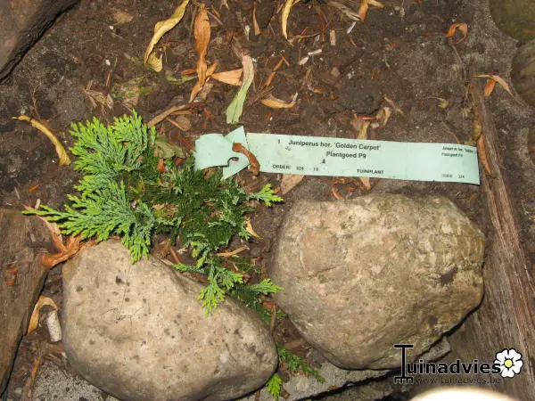Juniperus horizontalis 'Golden Carpet' ist ein niedrig wachsender, kriechender, buschiger Nadelbaum mit goldgelben kleinen Blättern, die im Winter einen bronze-violetten Farbton annehmen.