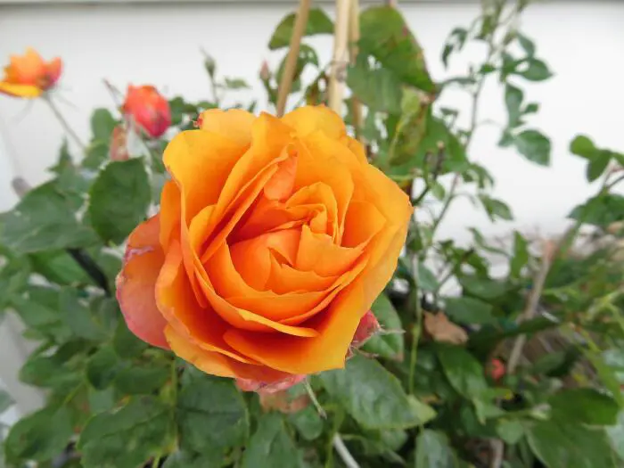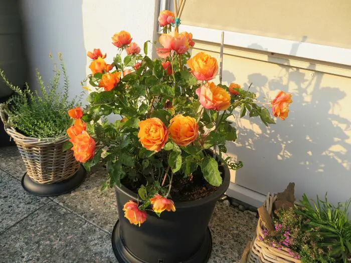 Rosa 'Estoril Beau Monde' ist eine Topfrose mit orange-gelben, gut gefüllten, großen Blüten und einem wunderbaren Duft.