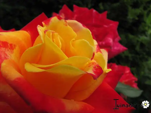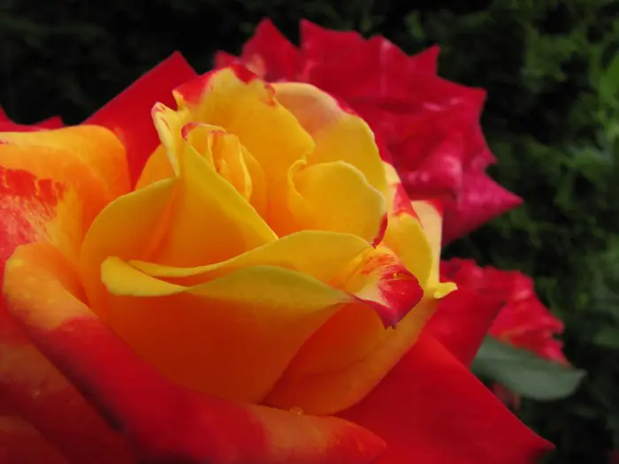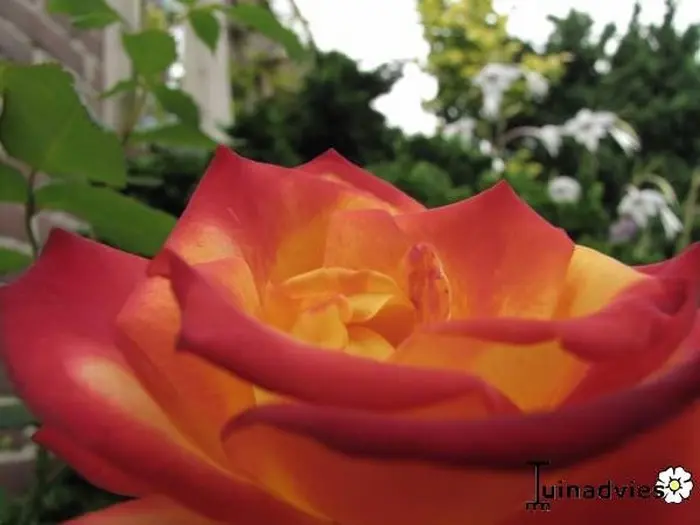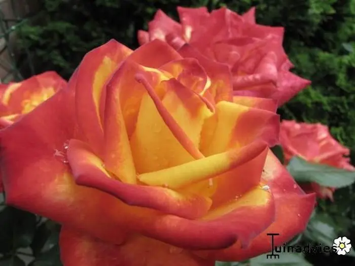 Rosa 'Mein München' blüht mit zweifarbigen Rosen in Rot und Orange-Gelb.Die grünen, glänzenden Blätter sind sehr gesund.