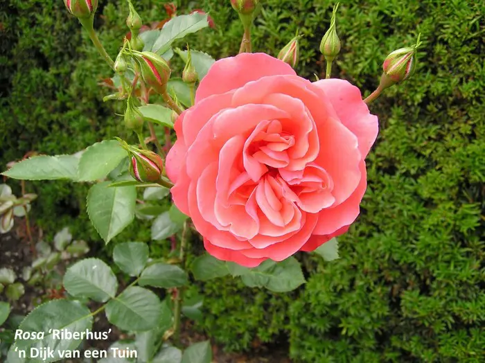 Rosa 'Riberhus' ist eine wiederblühende Rose mit leicht duftenden lachsrosa Blüten.Bildet einen buschigen Strauch (h150/w120 cm) mit glänzenden, dunkelgrünen Blättern.