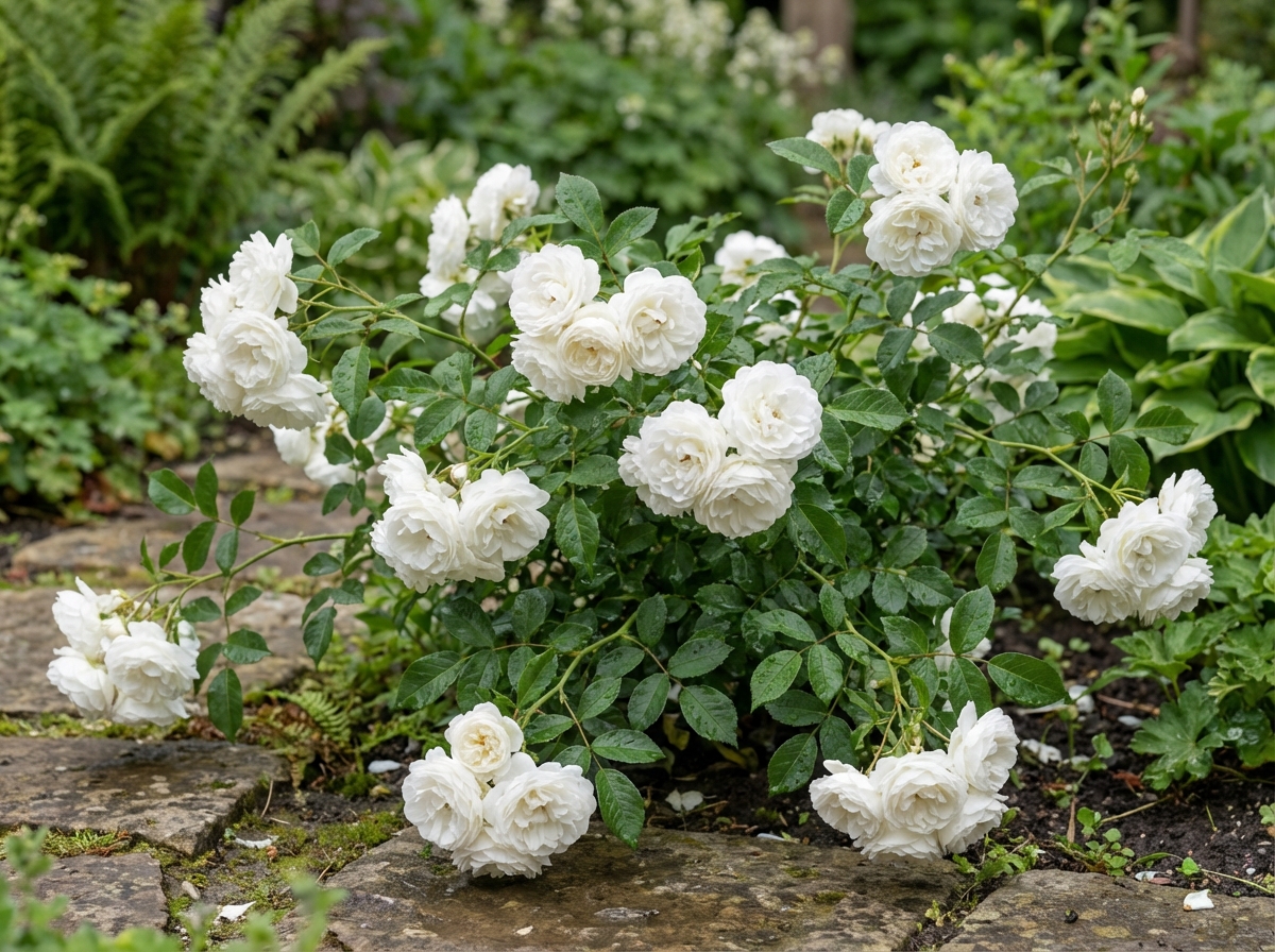 Rosa 'Snow Ballet' blüht mit kleinen, schalenförmigen doppelten weißen Rosen.Die kleinen Blätter sind glänzend dunkelgrün.Diese sanft duftende Rose kann als Bodendecker verwendet werden.
