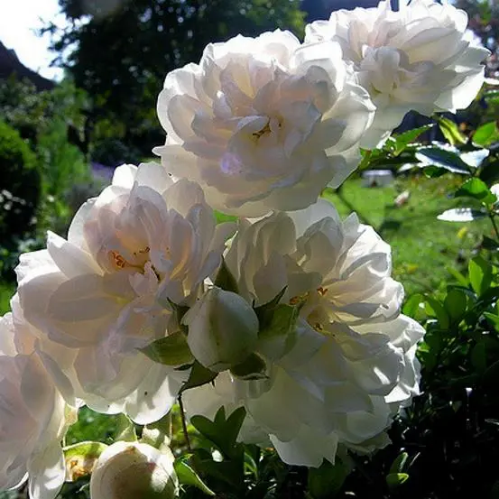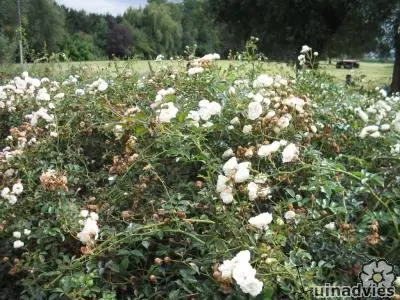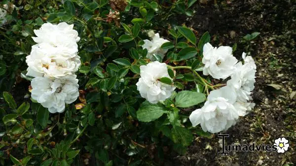 Es handelt sich um eine rein weiße, leicht duftende Rose, die in der Mitte beim Öffnen rosafarben ist, mit Büscheln von manchmal 20 Rosen von jeweils 6 cm
