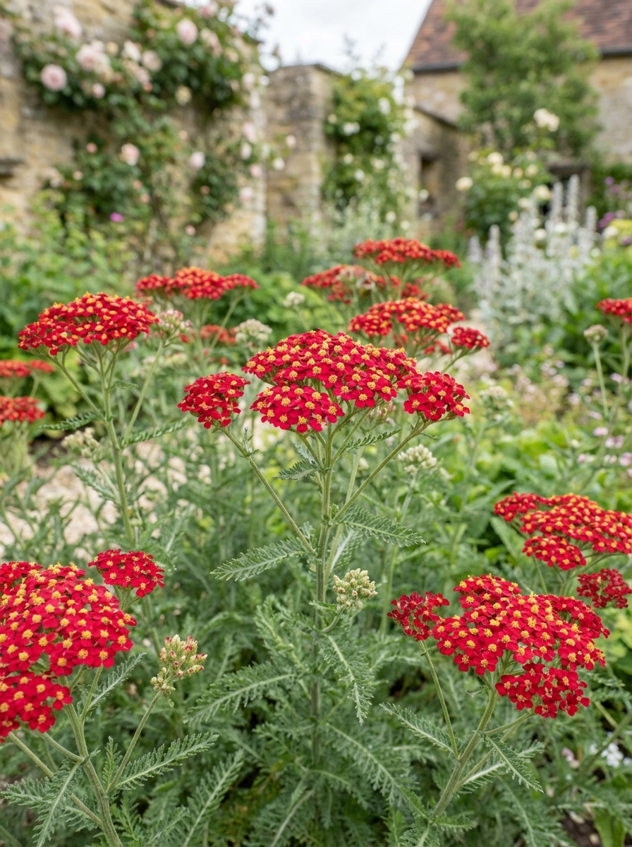 Er ist ein kräftiger Pflanzer mit wunderschönen, dunkelgrünen, gefiederten, aromatischen Blättern und Blüten mit abgeflachten, umbelförmigen Dolden aus roten Blüten mit einem kleinen gelben Zentrum. Die Blüten verblassen später zu Orange-Rot, sodass man eine Pflanze mit unterschiedlichen Rot- oder Orangetönen bekommt.