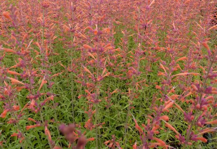 Agastache 'Feuervogel' blüht mit Stacheln aus röhrenförmigen orange-rosa blühenden Spitzen. Auch nach der Blüte bleiben Hochblätter noch lange farbig.