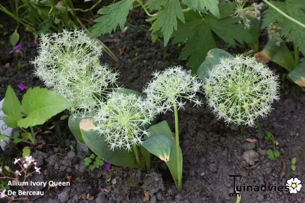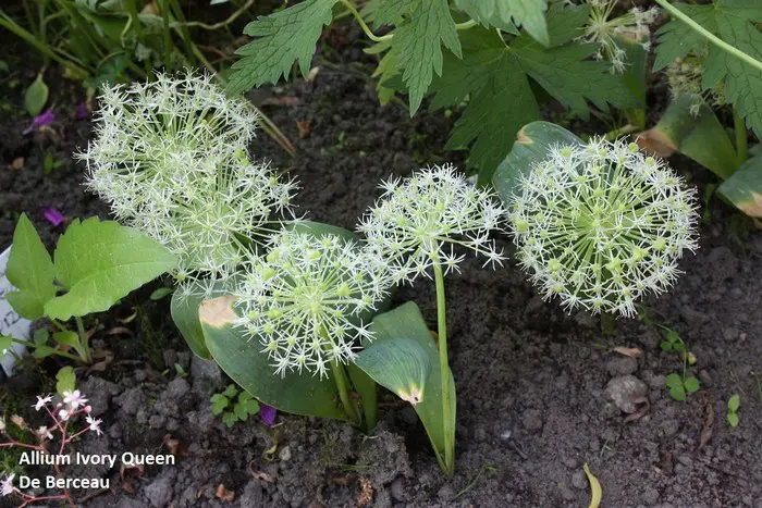 Allium karataviense 'Ivory Queen' ist eine niedrig wachsende, knollige Pflanze mit breiten, gewölbten, silbergrünen Blättern.