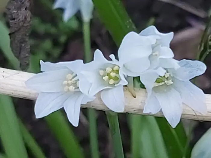 Bildet Pollen aus breiten, linearen, überhängenden grünen Blättern und blüht an quadratischen Stängeln mit glockenförmigen weißen Blüten mit einem unbedeutenden grünen Streifen.
