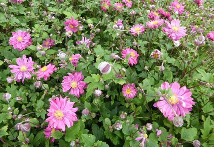 Anemone hybrida x 'Bressingham Glow' blüht mit halbdoppelten, leuchtend violettrosa Blüten und goldgelben Staubblättern auf kräftigen, hohen Stängeln. Die Blütenblätter sind leicht verdreht, was der Blume ein lässiges Aussehen verleiht.