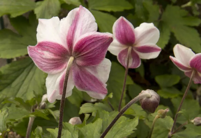 Anemone 'Dainty Swan' ist eine kleinblühende Sorte mit weißen Blüten und einem tiefrosigen Rücken.