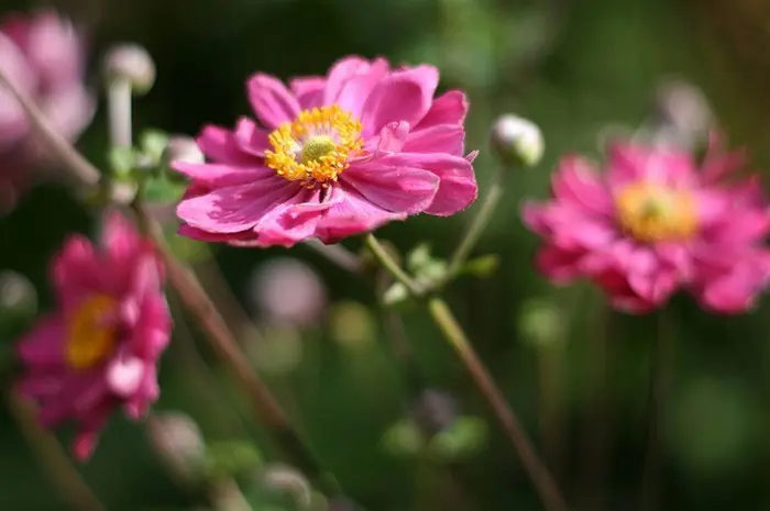 Anemone x hybrida 'Pamina' blüht an hohen, kräftigen Stängeln mit halbdoppelten, dunkelrosa Blüten mit recht flachen Blütenblättern und goldgelben Staubblättern im Herzen.