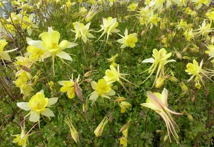 Aquilegia 'Maxistar' ist eine sehr anmutige Staude mit einzelnen goldgelben Blüten, einer weißen Krone und gespornten Blütenblättern.