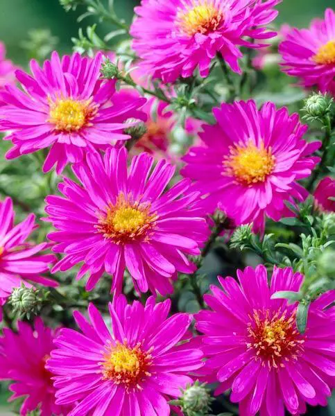 Aster dumosus 'Anneke' ist eine buschige, mehrjährige Pflanze mit kompaktem, kissenförmigem Muster und tiefviolett-rosafarbenen, gänseblümchenartigen Blüten mit goldgelbem Zentrum.