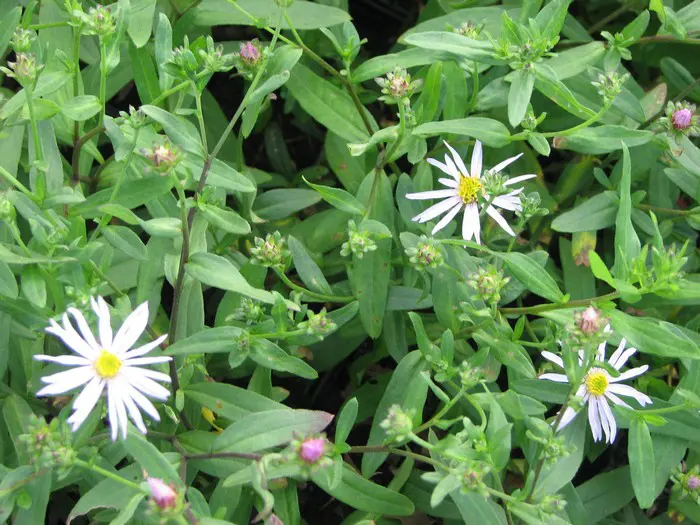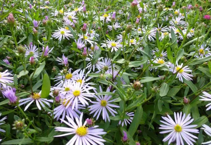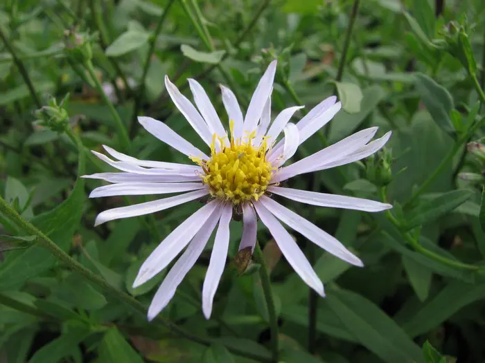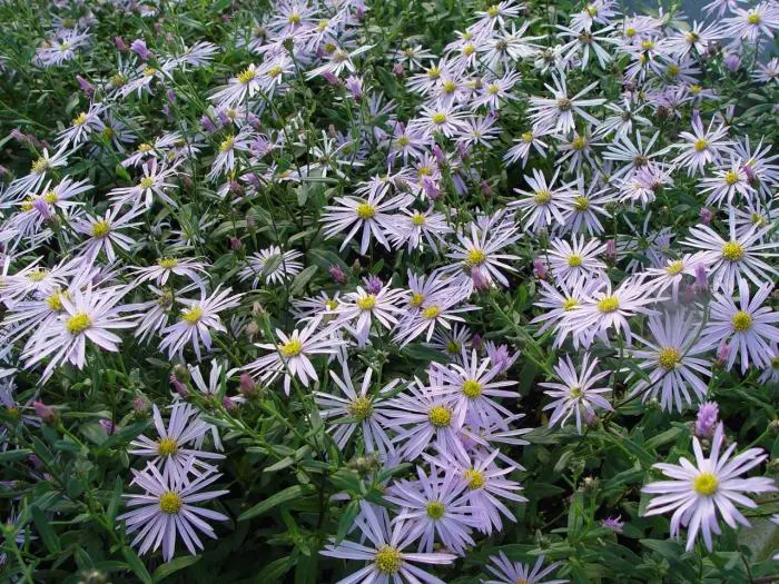 Aster pyrenaeus 'Lutetia' ist ein kompakter, hügelbildender Aster mit schlanken, verzweigten Stängeln und schmalen, länglichen, dunkelgrünen Blättern.