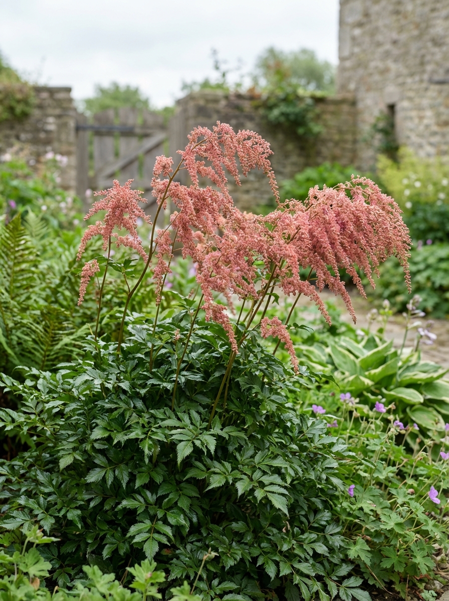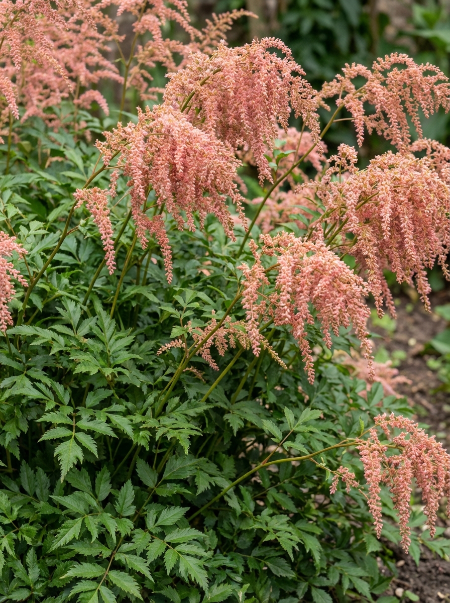 Astilbe thunbergii 'Straussenfeder' blüht mit sanften, rosafarbenen, federartigen Blüten.